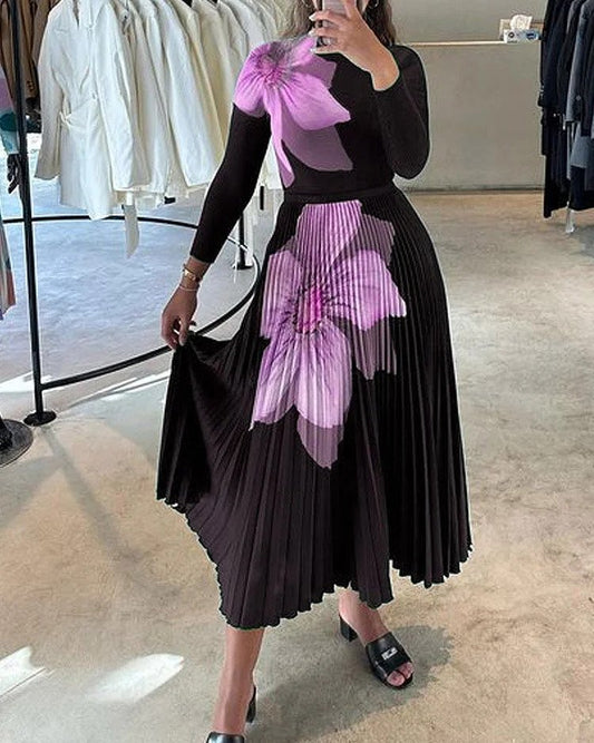 Printet Strikket Langermet topp og Trykt Plissert Skjørtsett