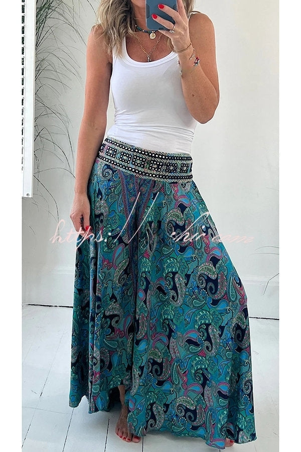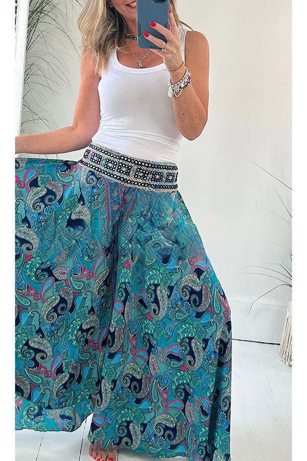 Etnisk Paisley Print Elastisk Patchwork Lettvektsbukser med lommer