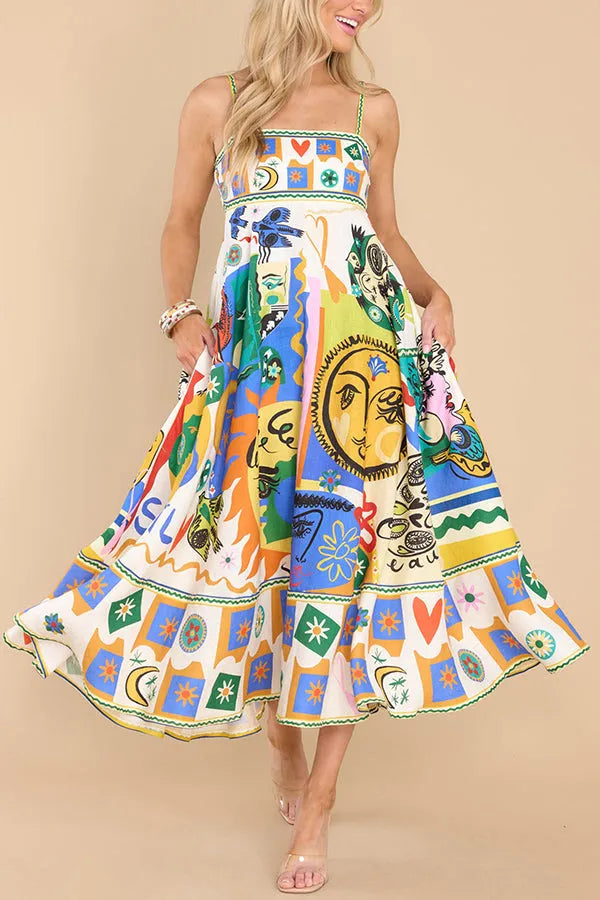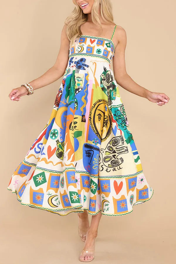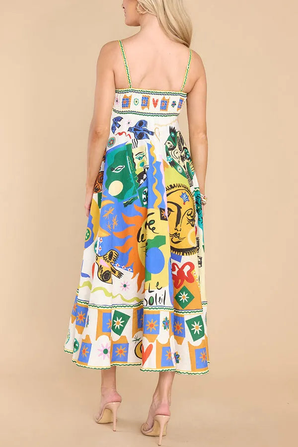 Gledelig glød gudinne lin blanding unik print lomme smocked tilbake midi kjole