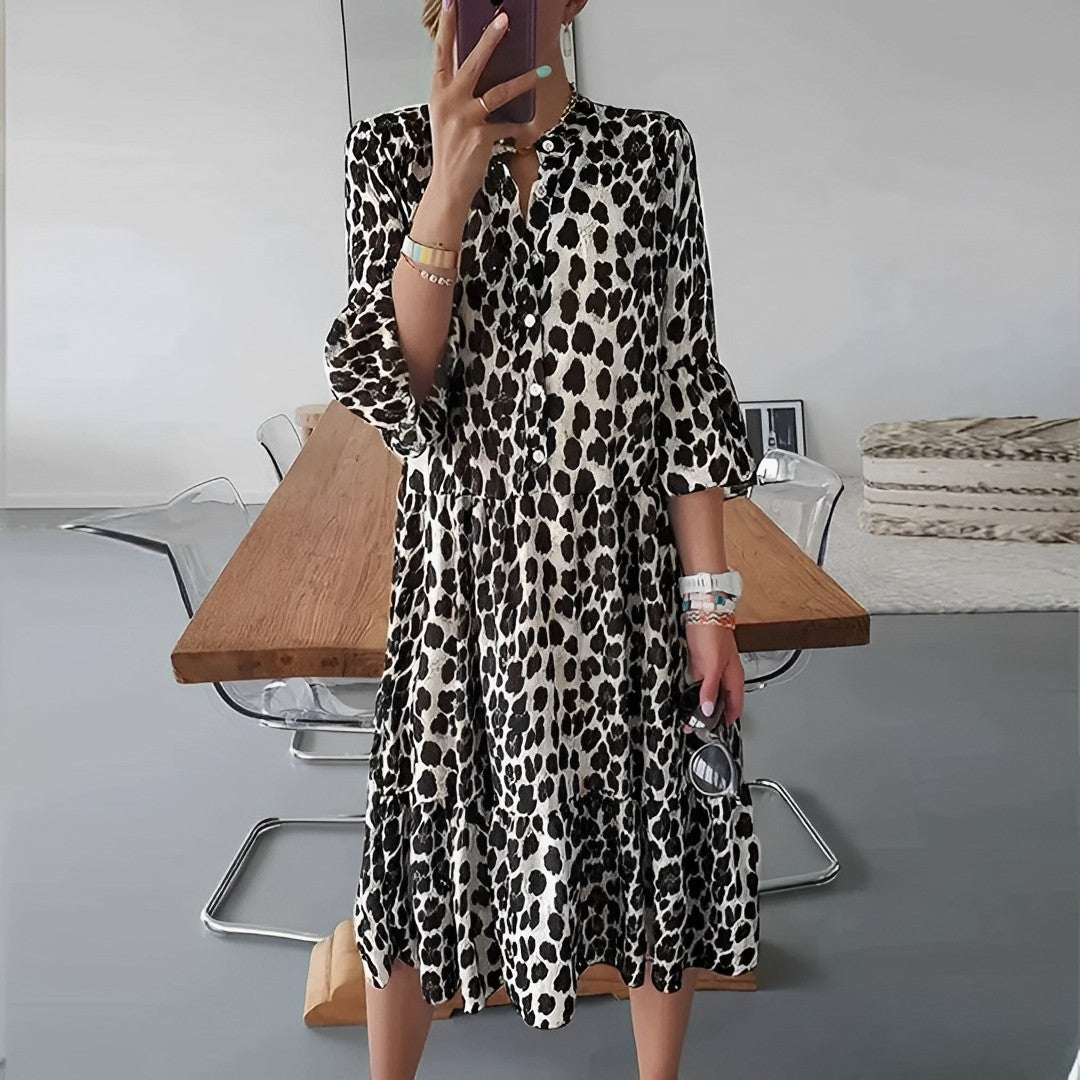 GRUSHA elegant kvinnekjole med leopardmønster er en elegant og trendy kjole for kvinner som ønsker å gjøre et dristig fashion statement.