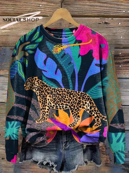 Kvinner Animal Leopard Floral Print Crew Neck Langermet Sweatshirt