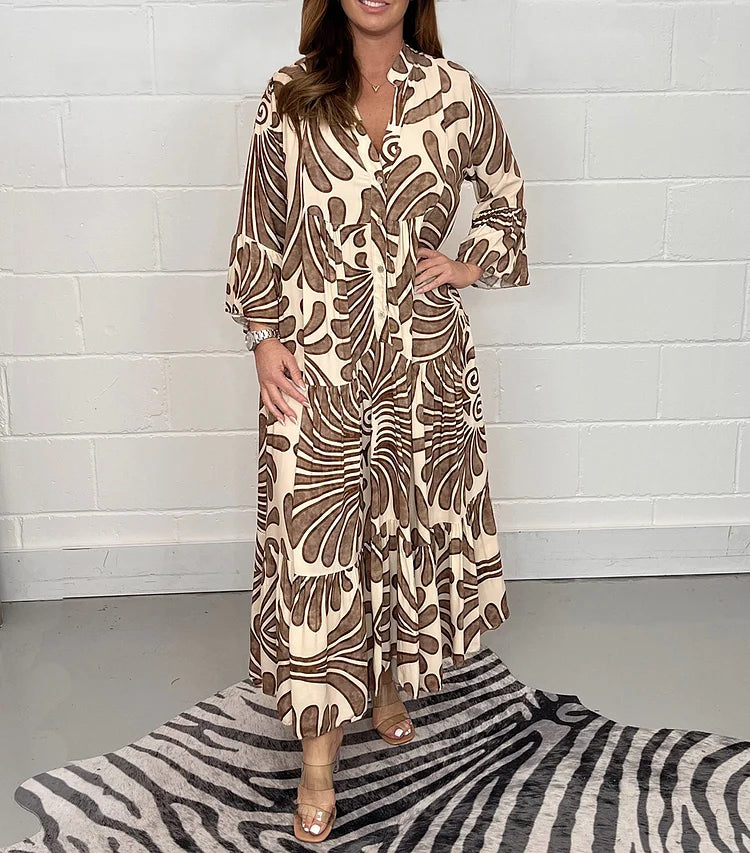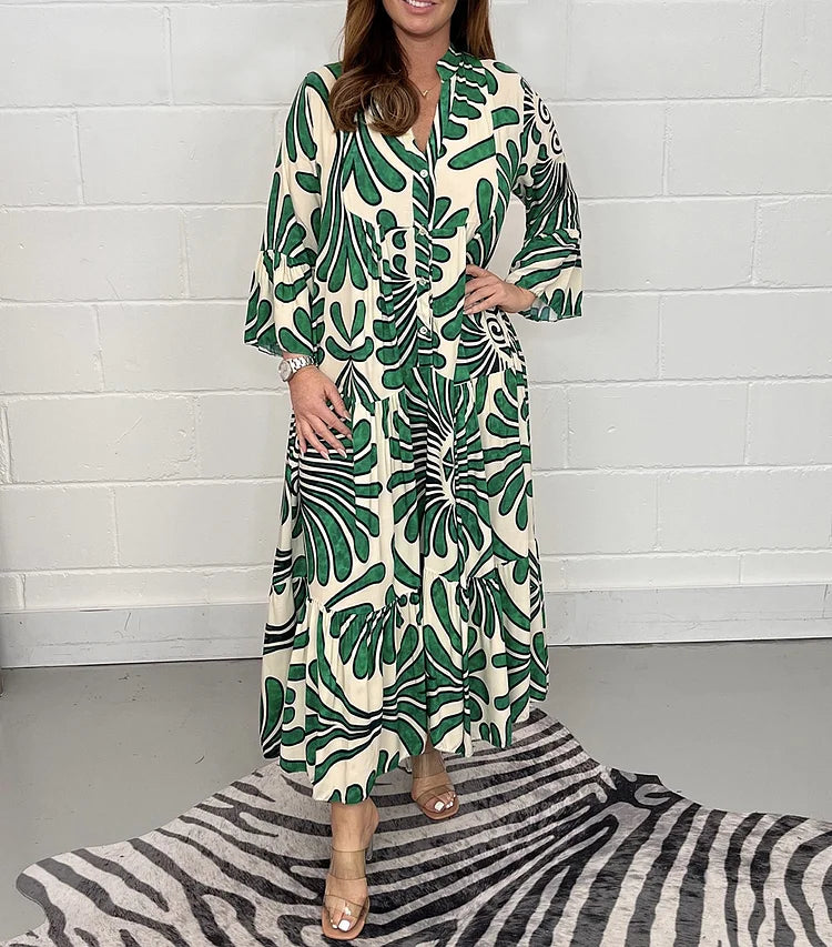 Denne printede maxikjolen med knapper vil bli din nye helgefavoritt! Den er lett, behagelig og luftig!
