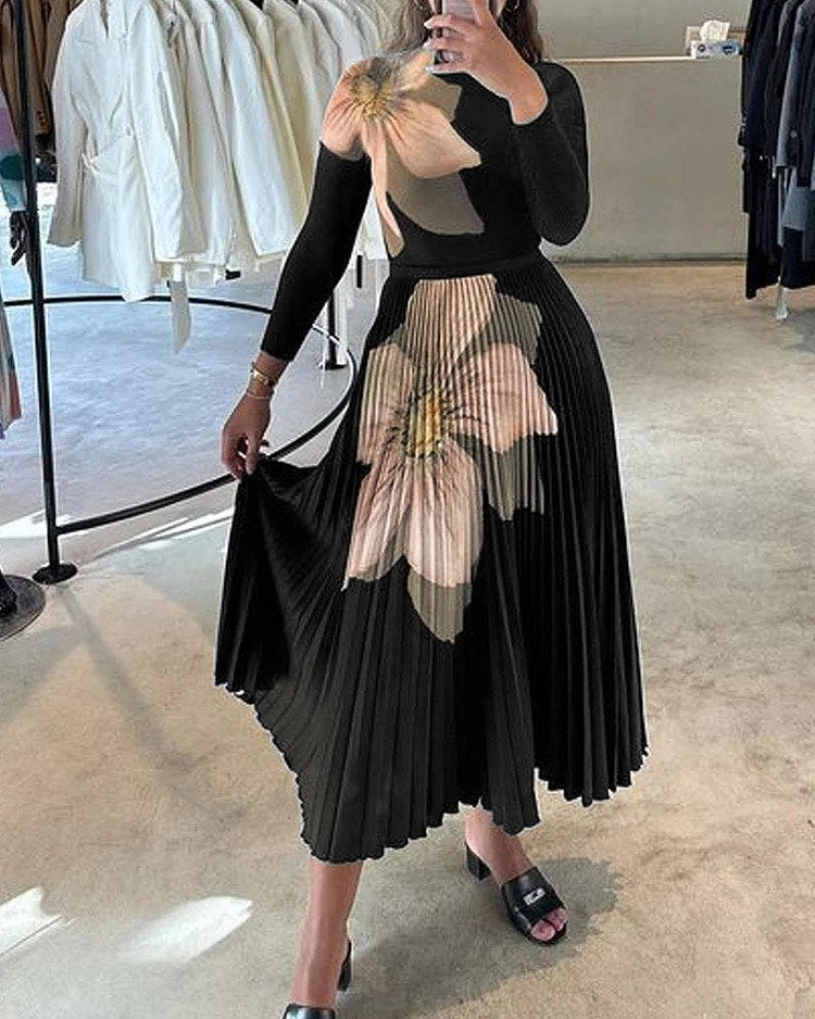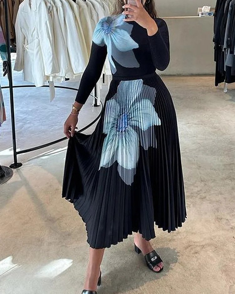 Printet Strikket Langermet topp og Trykt Plissert Skjørtsett