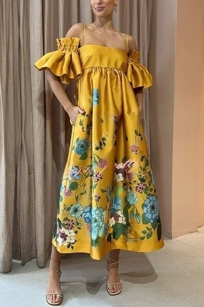 SØTESTE MARIGOLD-TRYKT SAMMLET ERME MED A-LINE MIDI-KJOLE