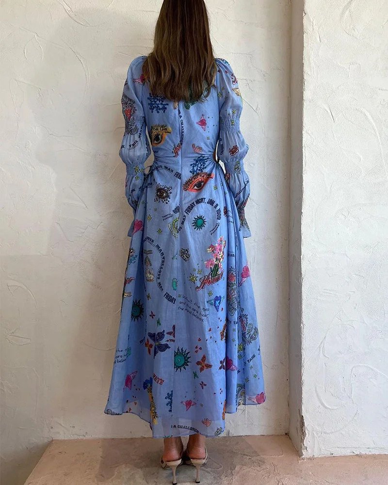 Bohemian Casual Print V-hals Wrap midje lang kjole
